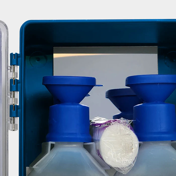 Equipped with two 500ml bottles of sterile saline solution featuring ergonomic eye showers, two sterile eye pads, conforming bandage, first aid tape and a shatterproof internal mirror, this station ensures quick and precise response during critical moments.